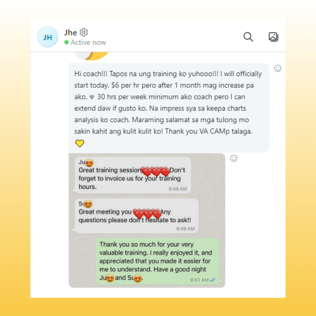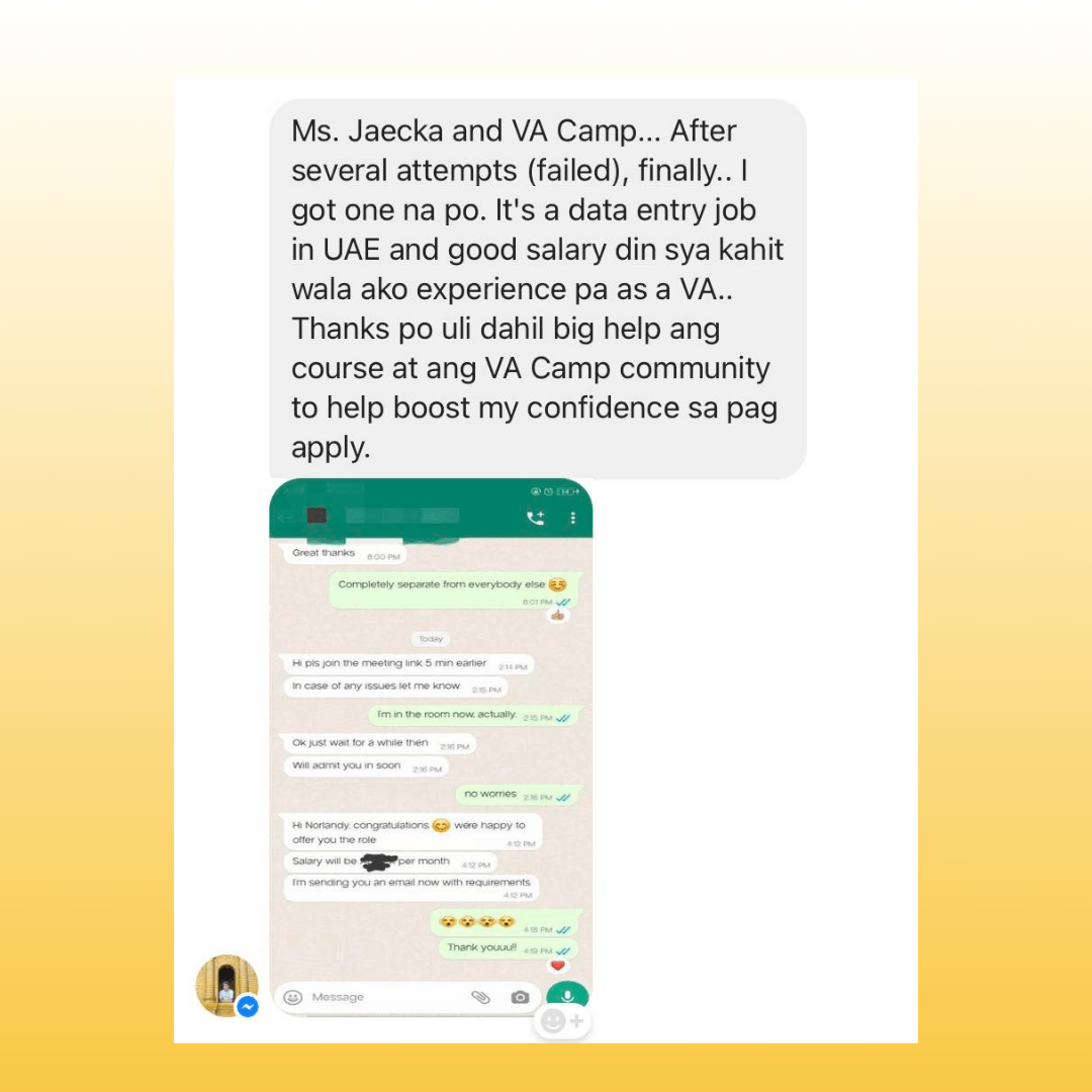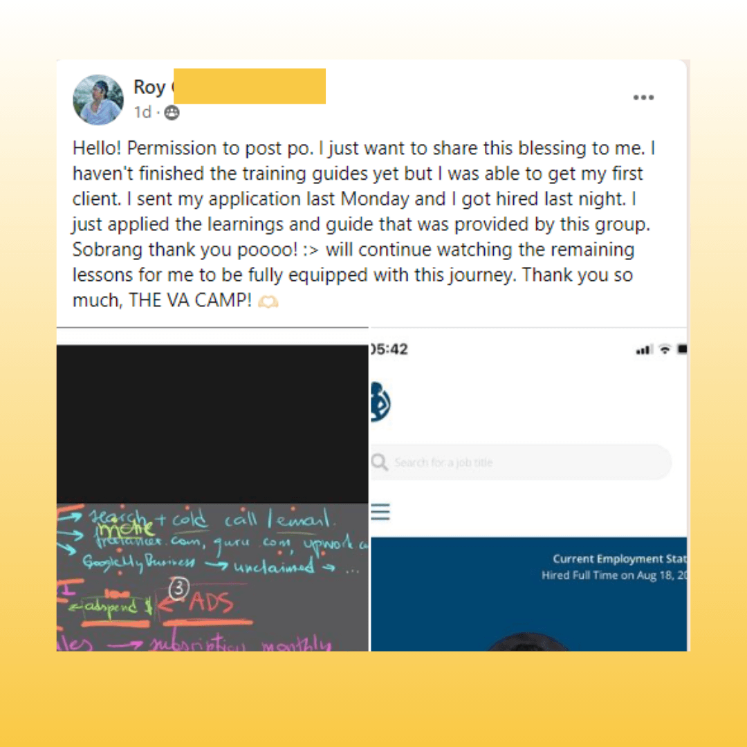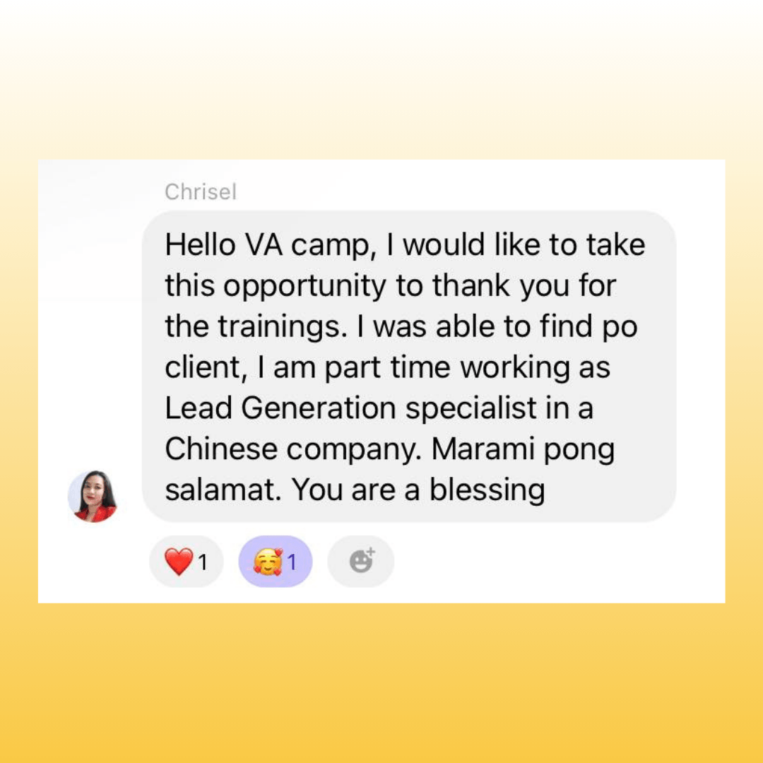 Sa ngayon we only provide training. Pero we are working on communicating with potential clients na pwedeng mag-hire sa mga students namin. But we have a support system sa community natin na malaking tulong rin sa pag-aapply nyo as a VA.