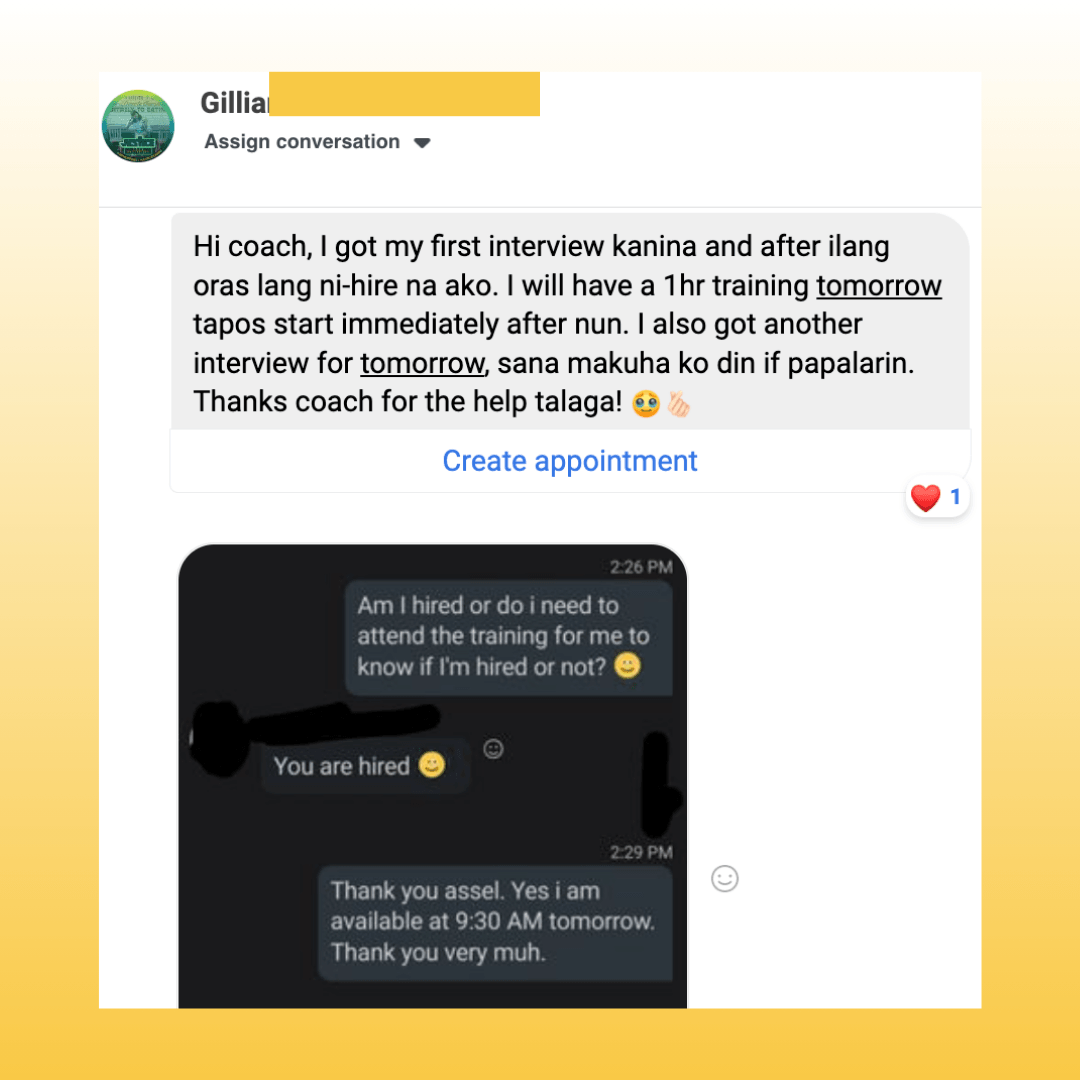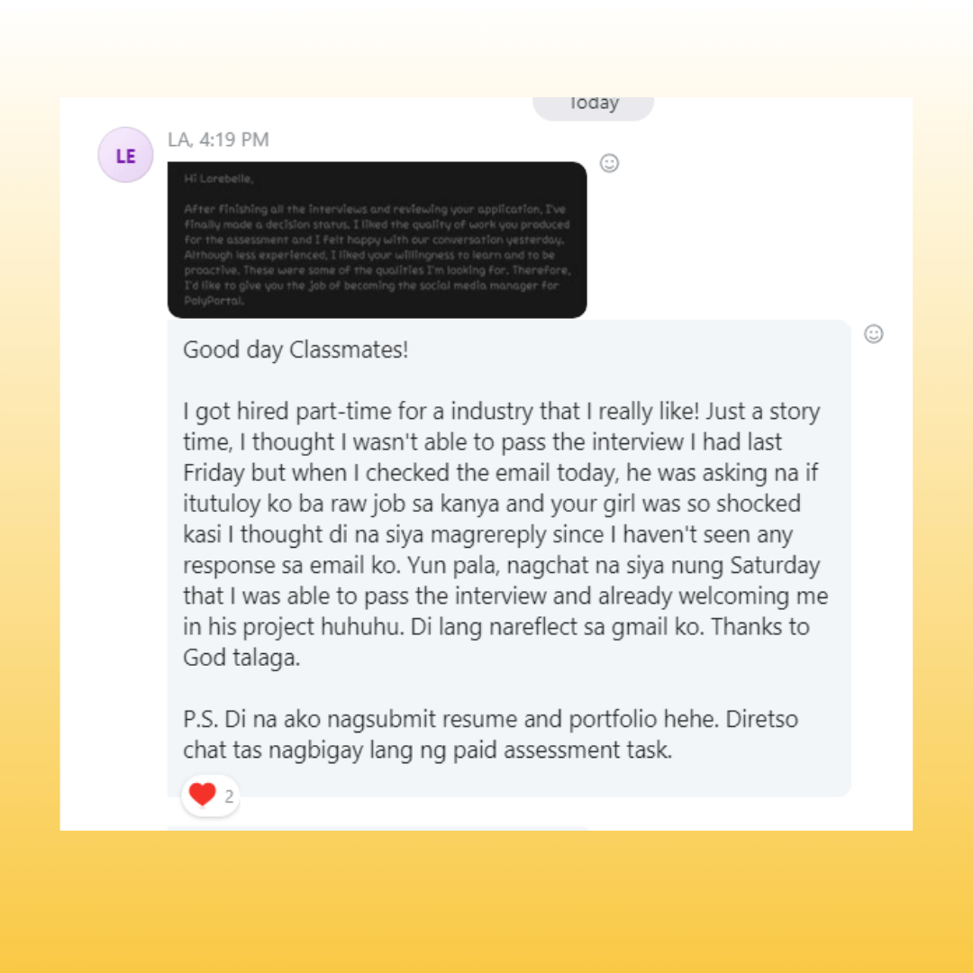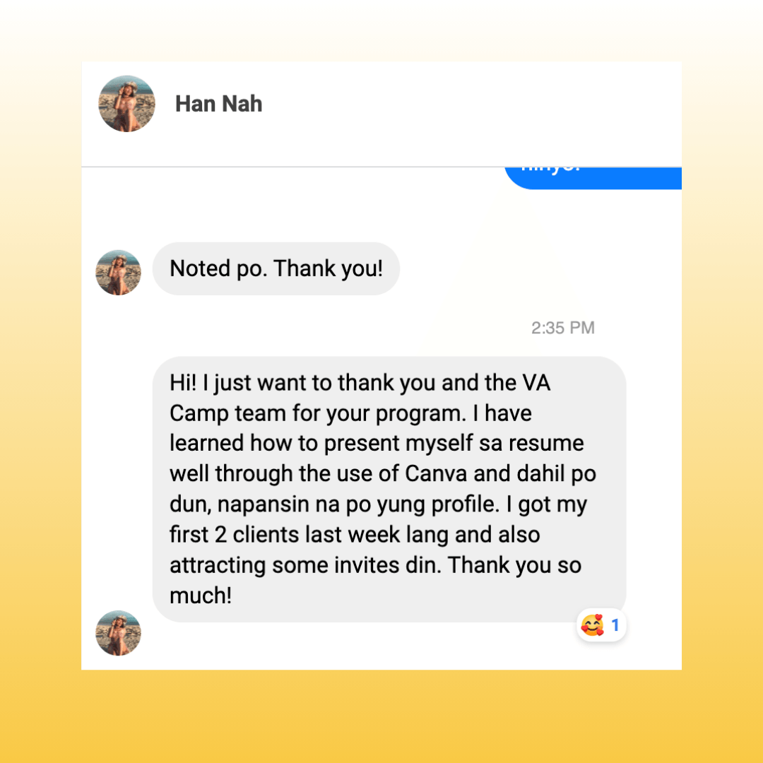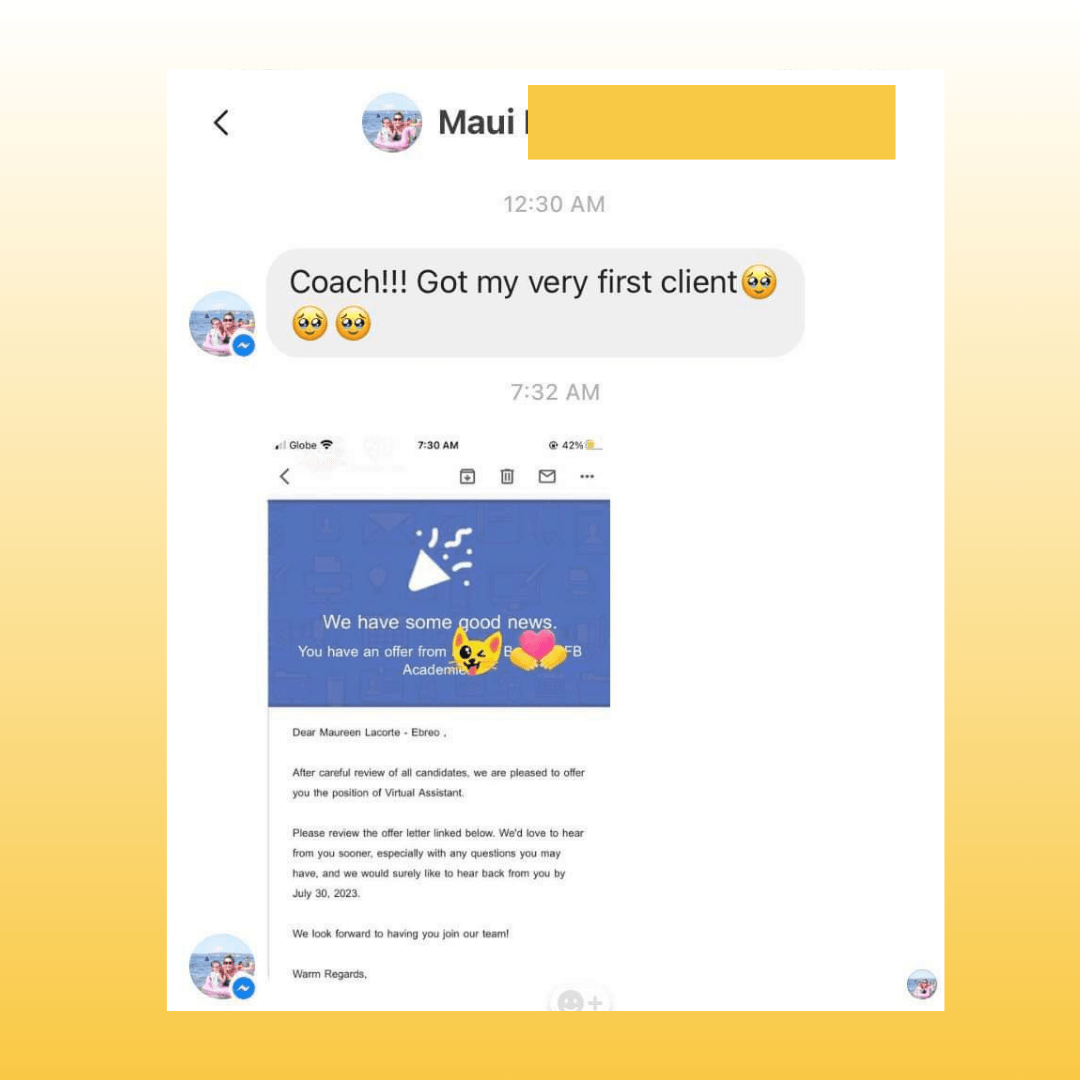 Sa ngayon we only provide training. Pero we are working on communicating with potential clients na pwedeng mag-hire sa mga students namin. But we have a support system sa community natin na malaking tulong rin sa pag-aapply nyo as a VA.